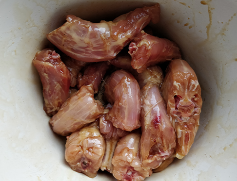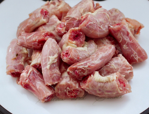 1、鸡脖子剁成段(1寸长),然后放在流水里冲洗干净(半个小时),控干水份;