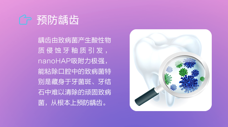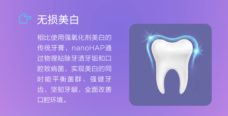 在刷牙过程中,HAP能有效吸附在细菌、牙菌斑牙结石及色素上,刷牙摩擦时,能够轻松去除牙齿表面的牙垢、牙渍、牙菌斑和牙结石,从根源上预防龋齿问题。