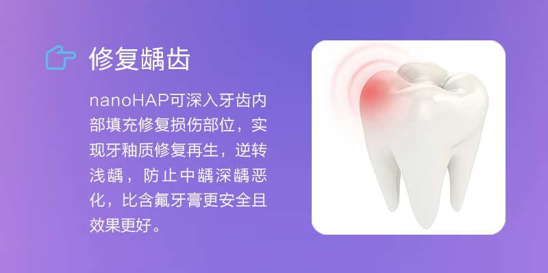 HAP还能起到填充剂的作用,因为与牙釉质成分相同,因此能够渗入牙釉质的损伤部位与牙釉质长成一体,恢复牙釉质的矿物质密度和表面光滑性,提高牙釉质对牙菌斑附着力和龋齿的抵抗能力,在牙齿表面形成“保护层”,同时提高牙齿的光泽和洁白度。