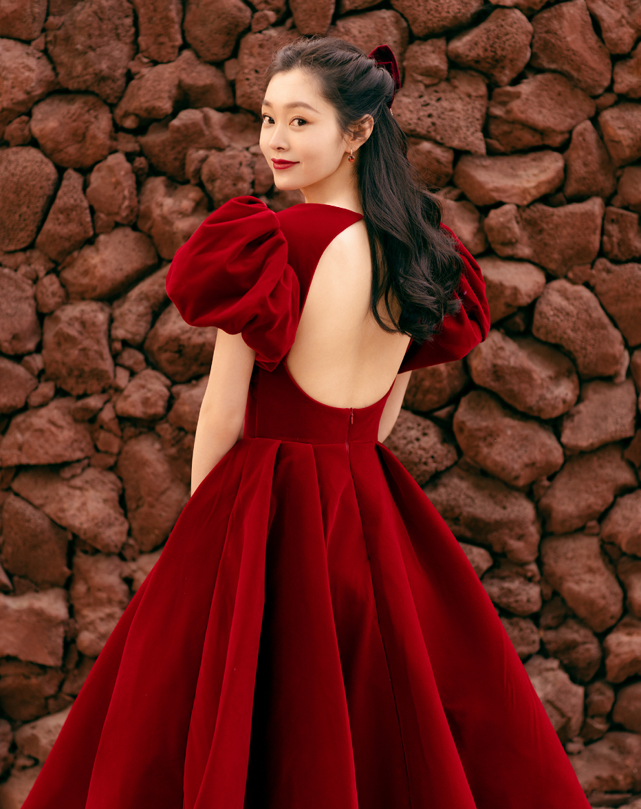 出席活动,她一身红色丝绒露背裙,性感中带着俏皮。