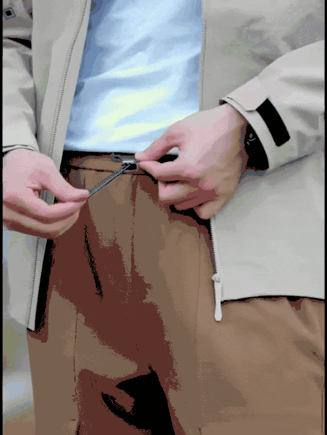 用梭织纤维与柔软弹力针织底复合而成,让面料兼具柔性和刚性,防风、防水的同时还有一定的弹性,才实现了上身好看又舒适。