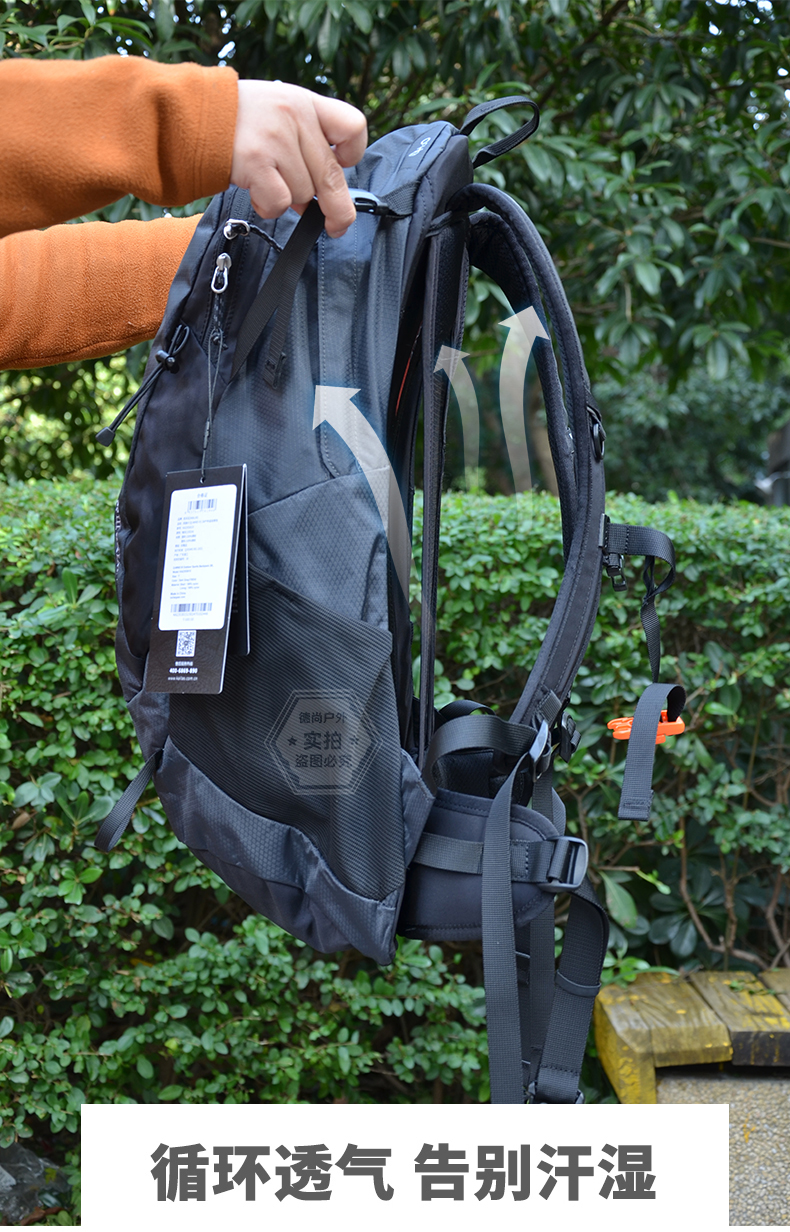 循环透气,干爽全程: 背部创新采用高弹隔空透气网布,有效减少背部与包体贴合面积,结合可调节弧度设计,在背部形成高效空气流通层。