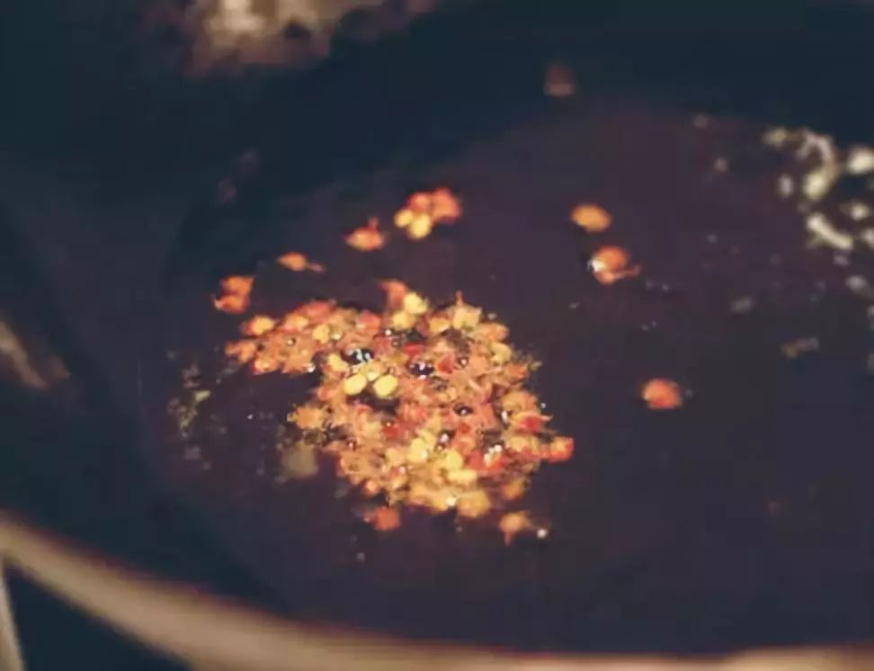 3、花椒粒(1平勺)放入锅里干炒一下,花椒粒裂开后放入1勺油(炒菜勺子),用小火慢慢烧,烧到冒烟后,花椒粒为褐色关火;