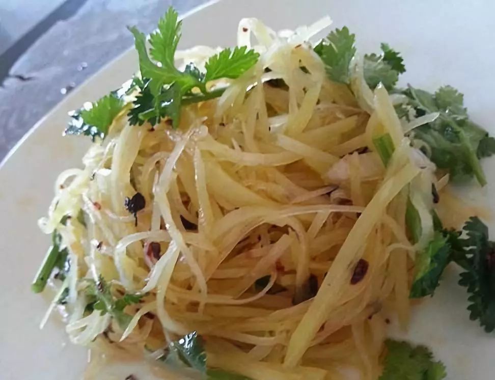 5、今晚想吃炝拌土豆丝,把土豆去皮切丝,然后冲水,接着焯水,捞出来控干水份,把之前做好的炝拌汁搅匀后放入1-2勺,拌匀后即可;