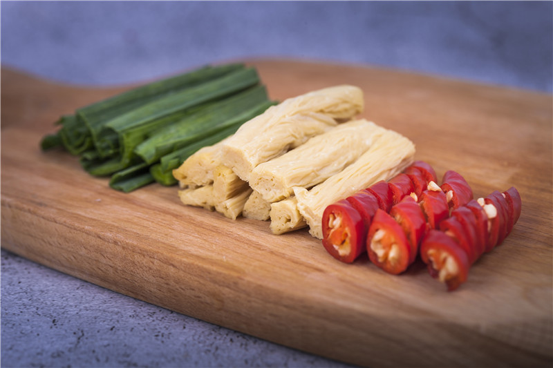 大豆清洗干净后经过8小时脱酸处理,采用三磨三分离技术后,煮浆,捞出,低温烘干。不去户外晾晒,避免苍蝇叮腐竹。腐竹直接就是切好的,泡发就可以进行烹饪,长短适宜,非常贴心。