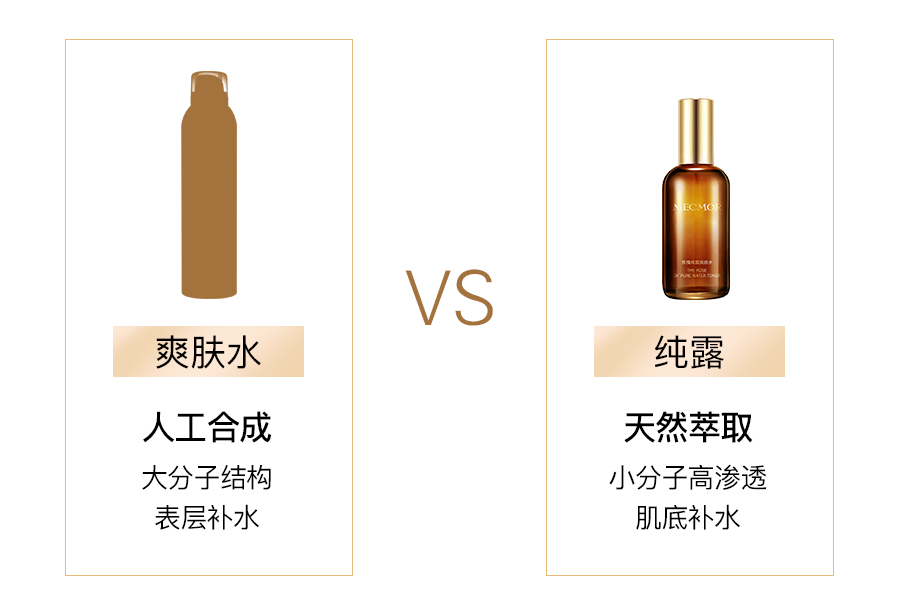 正宗纯露还含有2%-4%的精油,精油可以携带水分子直达真皮层,改善肌底缺水导致的干、黄、糙,补水效果是普通爽肤水的好几倍。