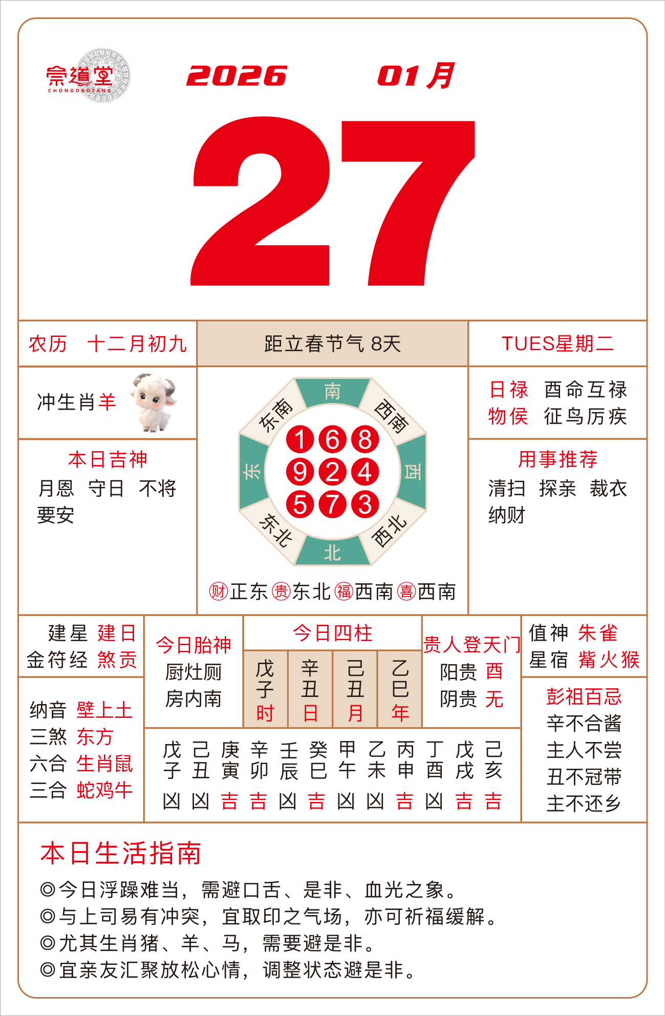 2026年1月28日 农历十二月初十 壬寅日 冲猴