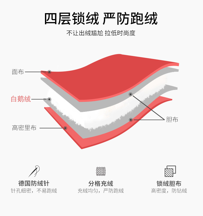 外层采用高密防水面料,里层采用亲肤里布,还增加防绒胆布固定住白鹅绒。