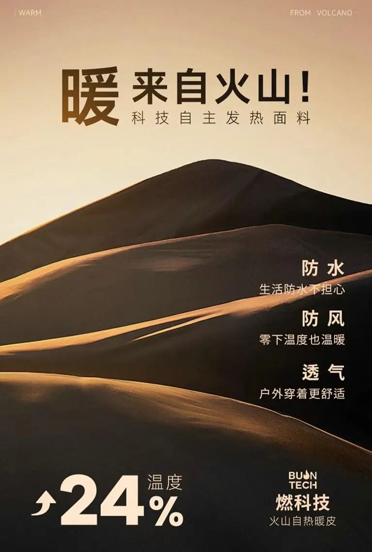 来自火山的科技发热面料,火山岩面料将火山岩和有机植物碳化材料结合在一起,对人体的温度保持有良好的效果。