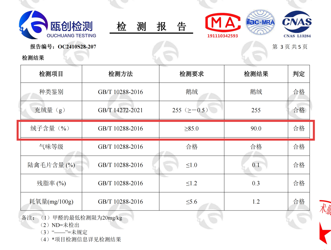 三款绒子含量都高达85%以上,要知道新国标合格率才81%......