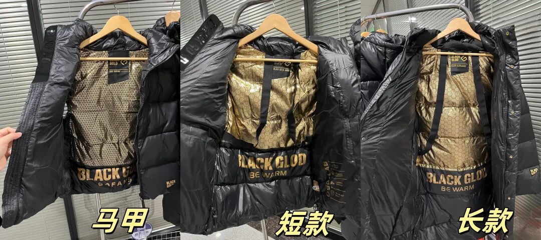 都是默认的黑金色,巨厚实的一件,长短款可以说是冬季滑雪必备了,帮你轻松抵御严寒~
