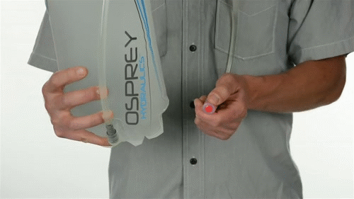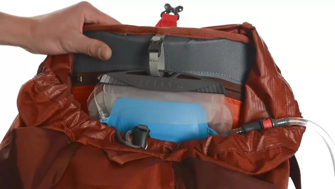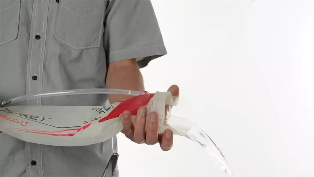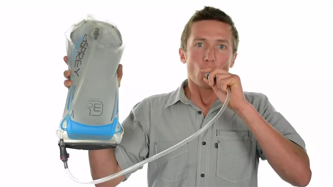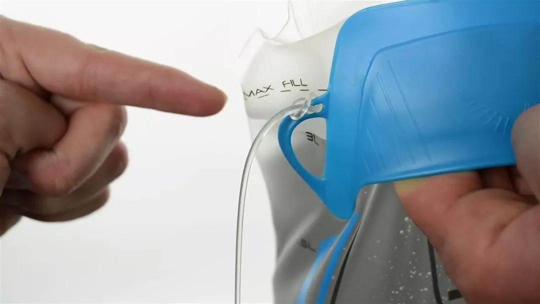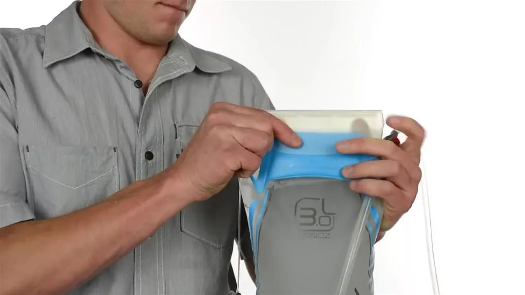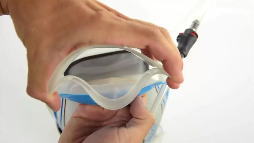 将水袋倒置,检查是否漏水,吸出多余的空气,防止水袋在背包中不必要的晃动。