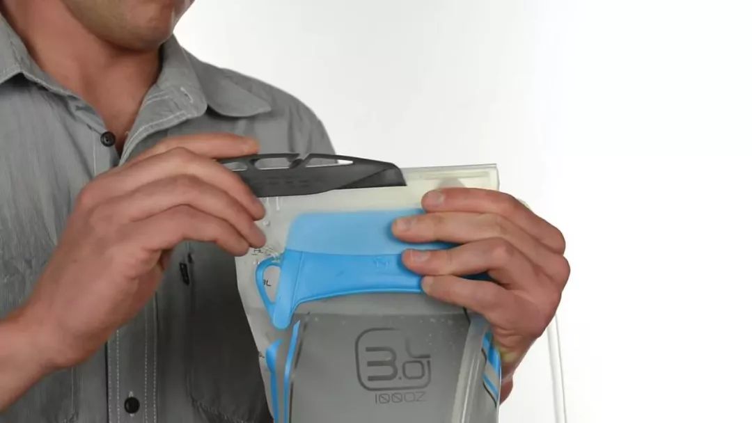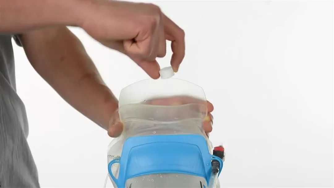 要给水袋注水,首先移除封口,打开注水保护罩,抓住手提把手。