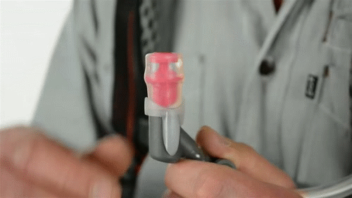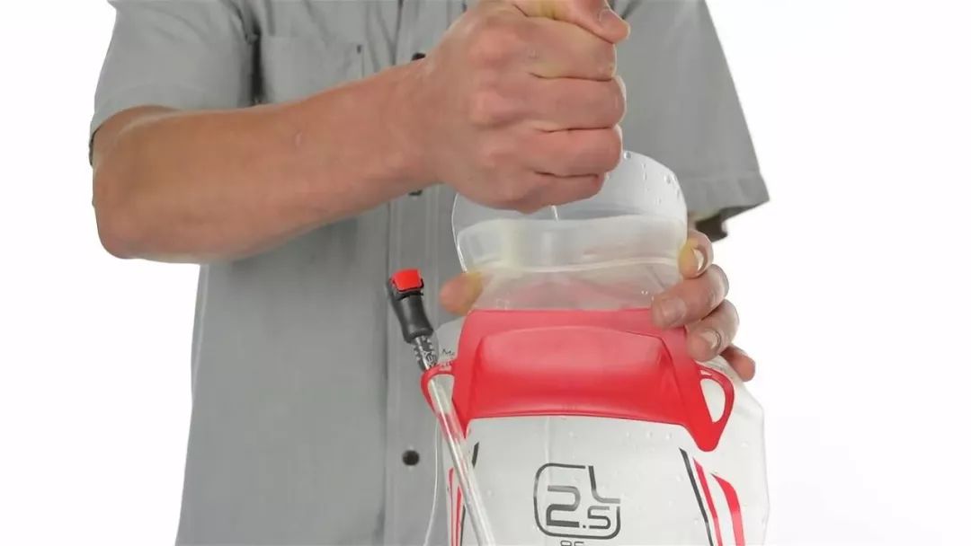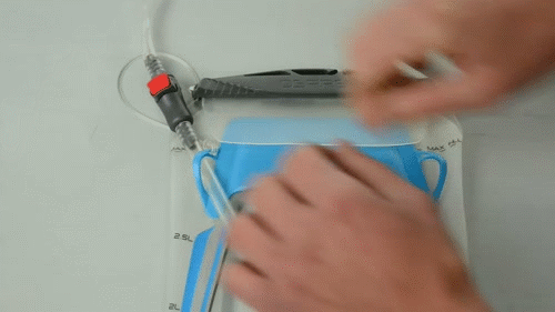 将水袋摇晃30秒,让溶液充分混合和分布。捏紧咬阀,握紧水袋释放空气,使溶液流入水袋软管和咬阀内。