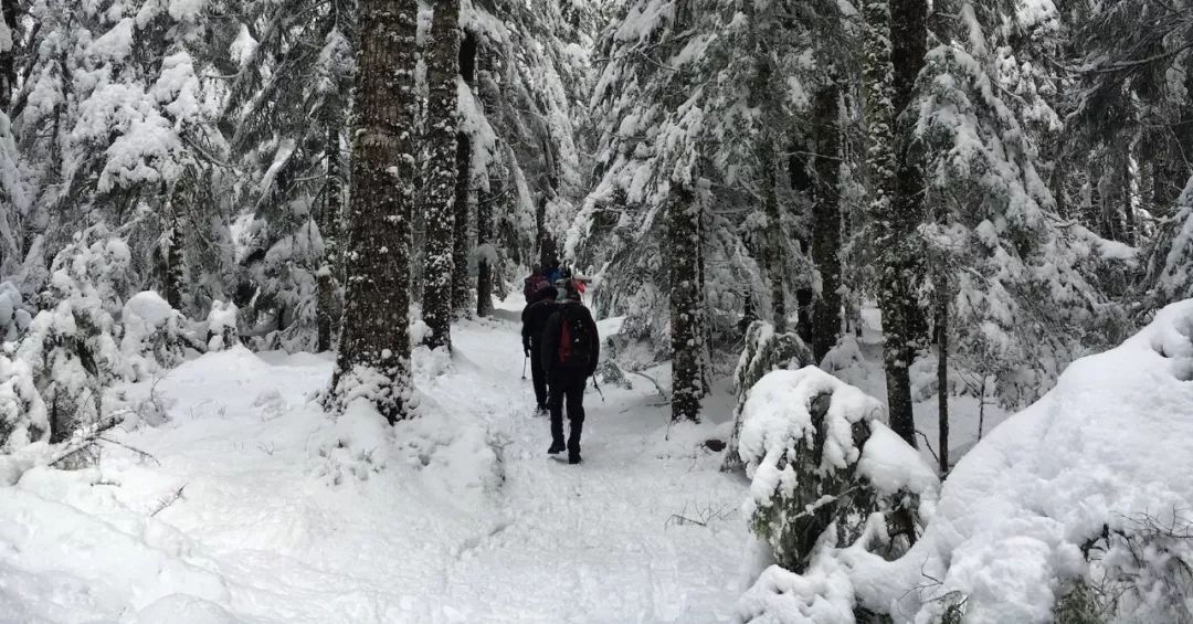 下雪坡时,在深厚的积雪中一走一出溜,很多山友索性坐下一路下溜,瞬间加速带来过山车般的刺激,留下一串俯冲的身影和开怀的笑声。