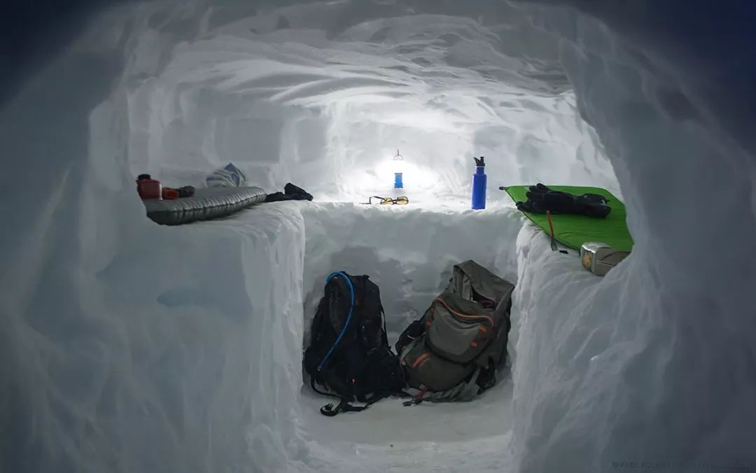 雪洞是良好的紧急避难所,防风且隔热性能好,洞内会保持在微低于0℃的温度,“足够的厚度、迎风坡、雪密度大”是山友们的选址原则。