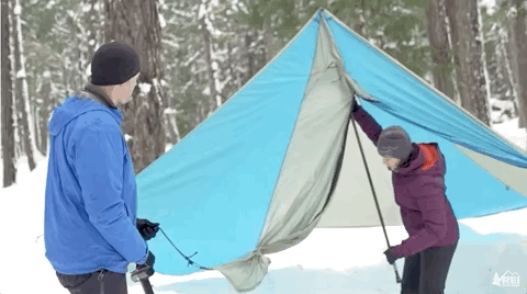 夏天露营,山友们总会带着桌子、凳子围坐聊天吃饭、畅所欲言。但冬天太冷,一到营地就钻进帐篷,太单调。大家可以用雪铲、金字塔或天幕创造温馨的雪地客厅,丰富营地生活。