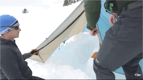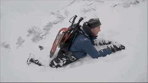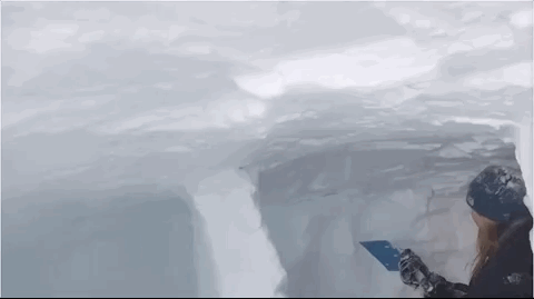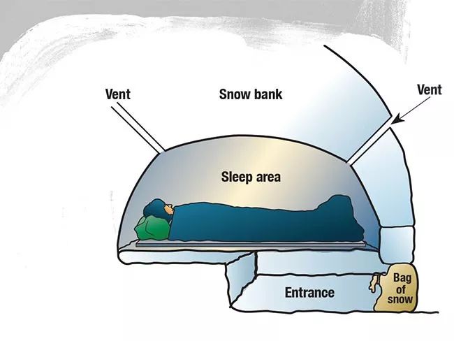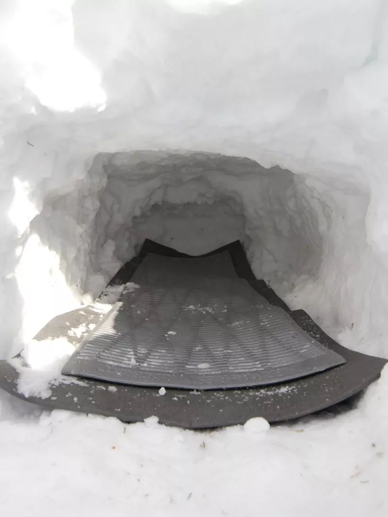 也可以挖个复杂的“一室一厅”,结构包括一个人能爬着进出的小通道,一个开阔的内部空间用来睡觉,有些山友还会用登山杖在“主卧”捅一个“通气孔”。