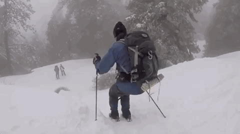 在城里,追求“成熟”的我们放弃了见雪就溜的孩子气,但冬季行山,到处是积雪的山坡,很容易让人放飞自我,比如,屁降式溜雪就是山友们的最爱。