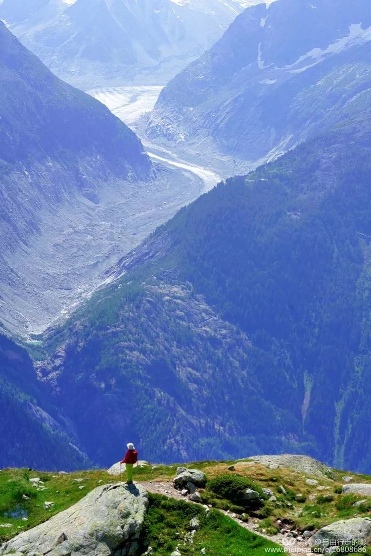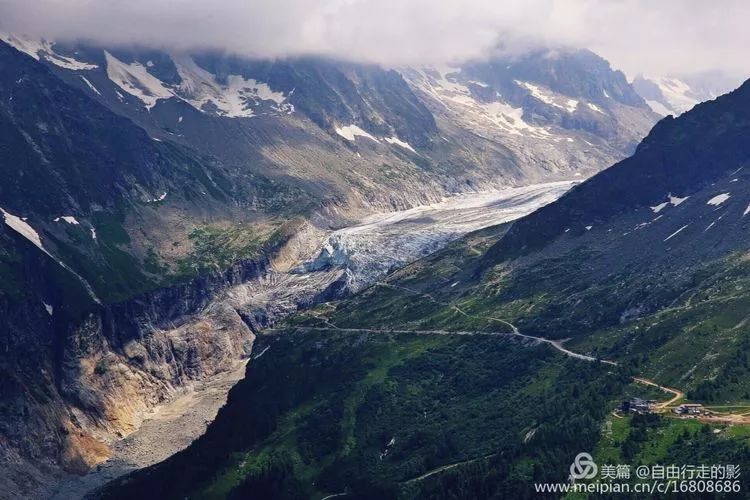沿着山势而下的巨大冰川,万年寒冰泛着幽蓝色的光泽,不知这壮美的景色还能保持多久,今年的欧洲也好热啊,三十多度的高温已经让冰川融化更加严重了。