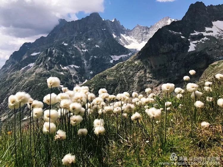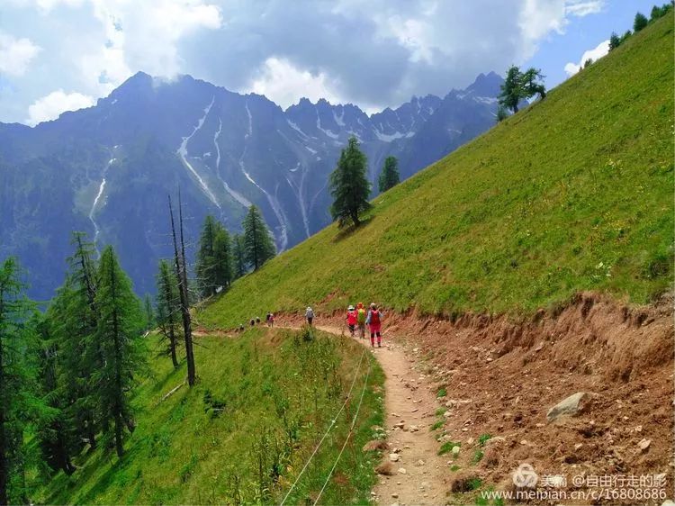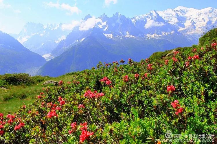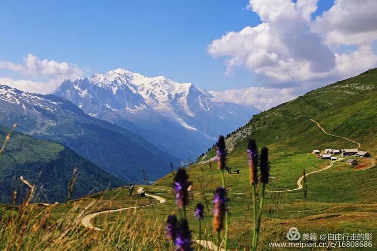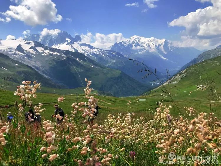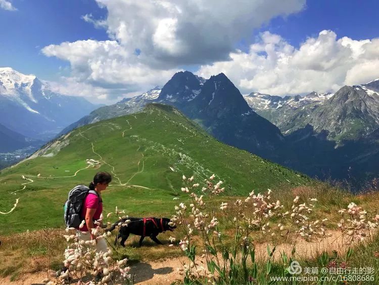 略休整后,准备开始翻越海拔 2191 米的 Balme 垭口。前段路程较平缓,我们像风一样自由,走在半山腰的小径上,左边是鲜花盛开的山坡,右边是大气磅礴的勃朗群峰和高山草甸田原风光。