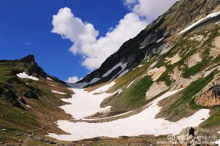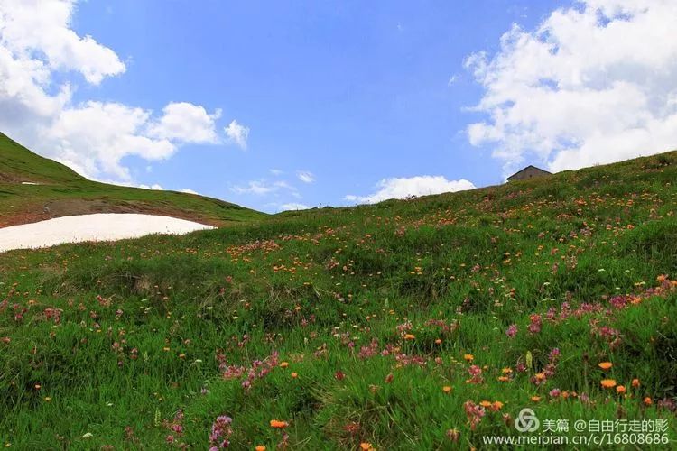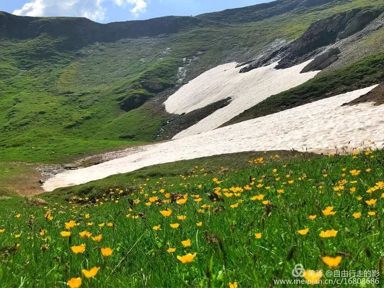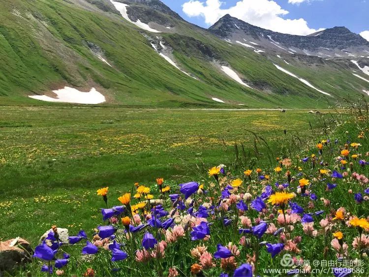 接下来的路彷佛是走进了伊甸园,山谷里路途平坦,两侧山体还有尚未融化的冰雪,谷地里延伸着平坦的开满鲜花的草原,人在花中行,怎能不沉醉,如果不是为了赶时间翻越前方的垭口,定要在这么美丽的地方好好玩一番,可惜了此情此景了。