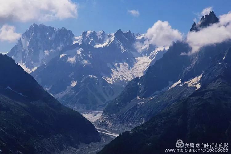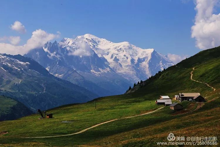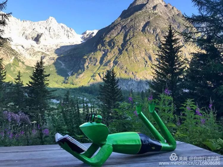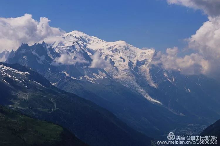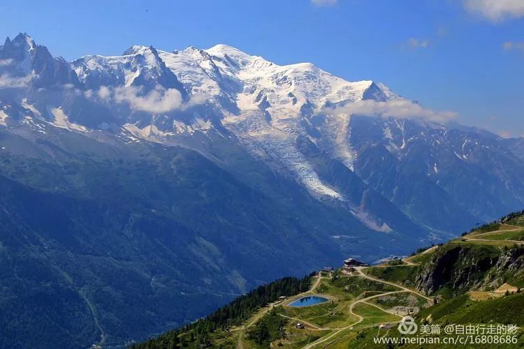 推开酒店的门,被积雪覆盖的顶峰浑圆的勃朗峰直接闯入眼中,山上幽蓝巨大的冰川沿着陡峭的山崖倾泻而下,天蓝得刺眼,炙热的阳光毫不吝啬的挥洒在大地上。