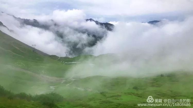 今天的下降强度是几天以来最大的,远方缥缈的云雾中绿色的山坡上隐约可见电线塔,我们快下到山底了。回首走过的路,我们曾经从那高山的云雾中走下来,现在已经走在乡间的小路上,暮归的老牛和我作伴。