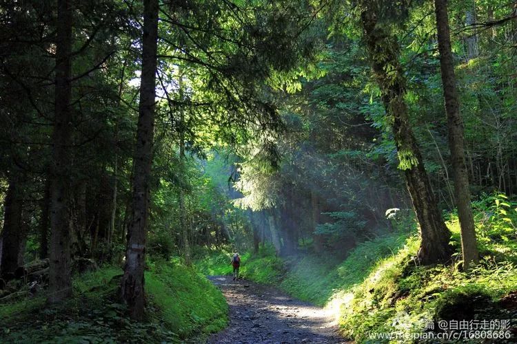 我们继续沿着林中小路向山上攀爬,清晨的太阳照耀着美丽的阿尔卑斯山脉,明媚的阳光在绿色的草地和森林中变幻出美丽的光影,路边的花儿上露珠晶莹剔透,花儿也显得格外鲜艳美丽。