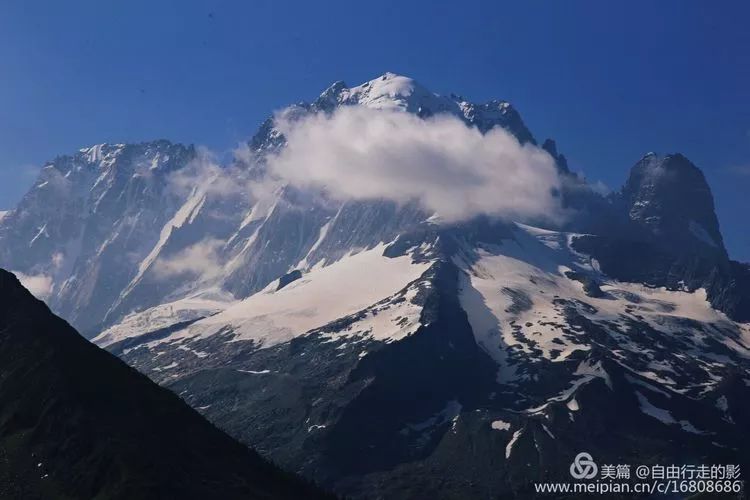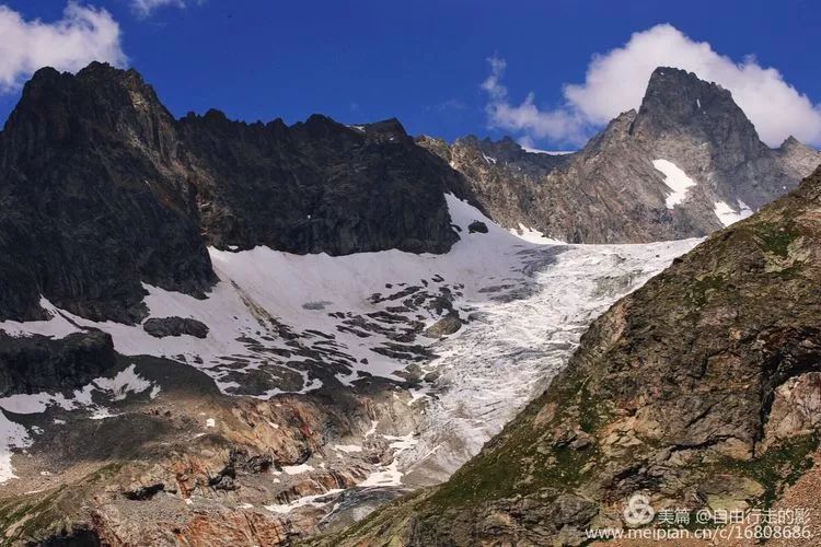 四周群山环绕,景色非常壮观。山上大片的冰川近在咫尺,我们从冰雪下的小路走过。越过一个山头后面还有更高的山头。