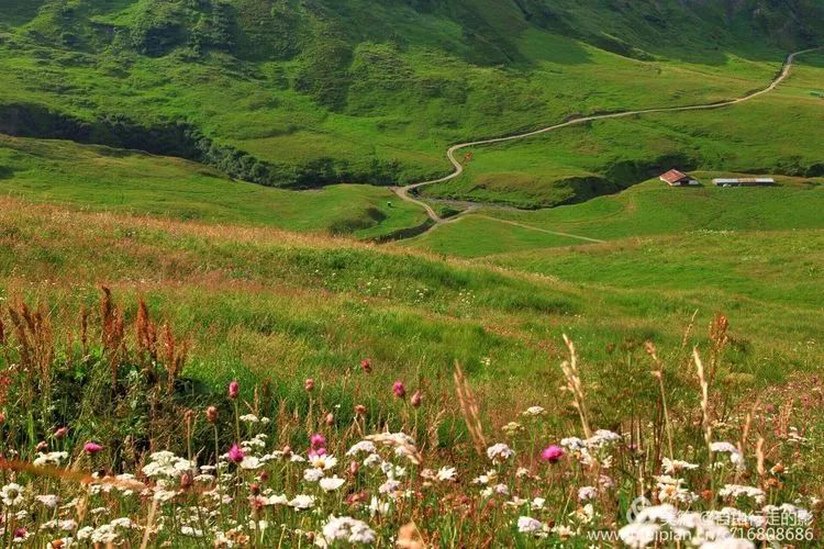 风光转换,听到牛铃声声,山势也由陡峭转为缓和,一路观赏瑞士美丽的高山草甸风光,鲜花盛开的草甸总是能吸引我们的眼球,牵绊我们前进的脚步。路上看到小木屋上的国旗也变成了瑞士的旗帜。