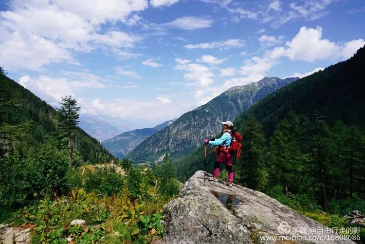 后段路程一直向上攀升,帅哥领队拍下了我奋力攀爬的画面,终于我们登上了海拔 2191 米的 Balme 垭口。临风而立,目及之处满眼是翠色的森林、五彩缤纷的花毯和白色的雪山,成就感由然而生。
