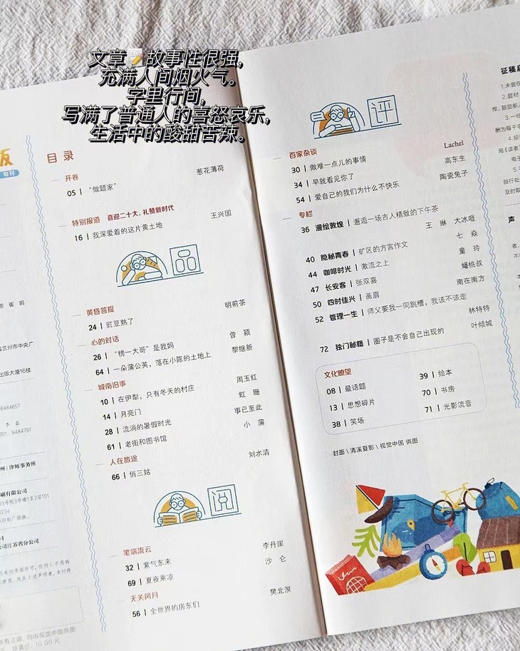 📗原创版杂志,所选文章的故事性很强,充满人间烟火,很多文章记述了普通人的喜怒哀乐,生活中的酸甜苦辣。杂志内的栏目名极具特色,如无关风月、笔端流云等。