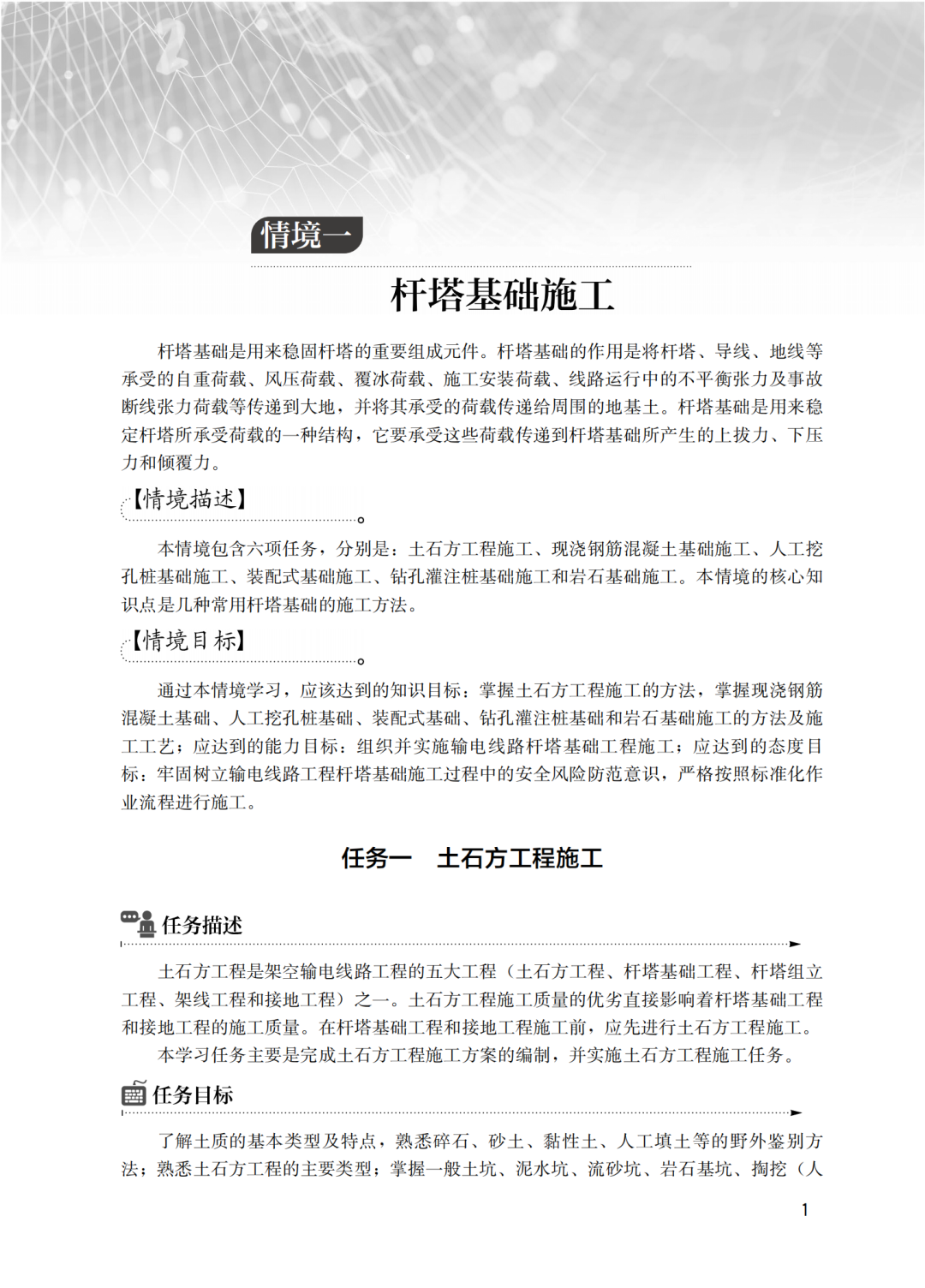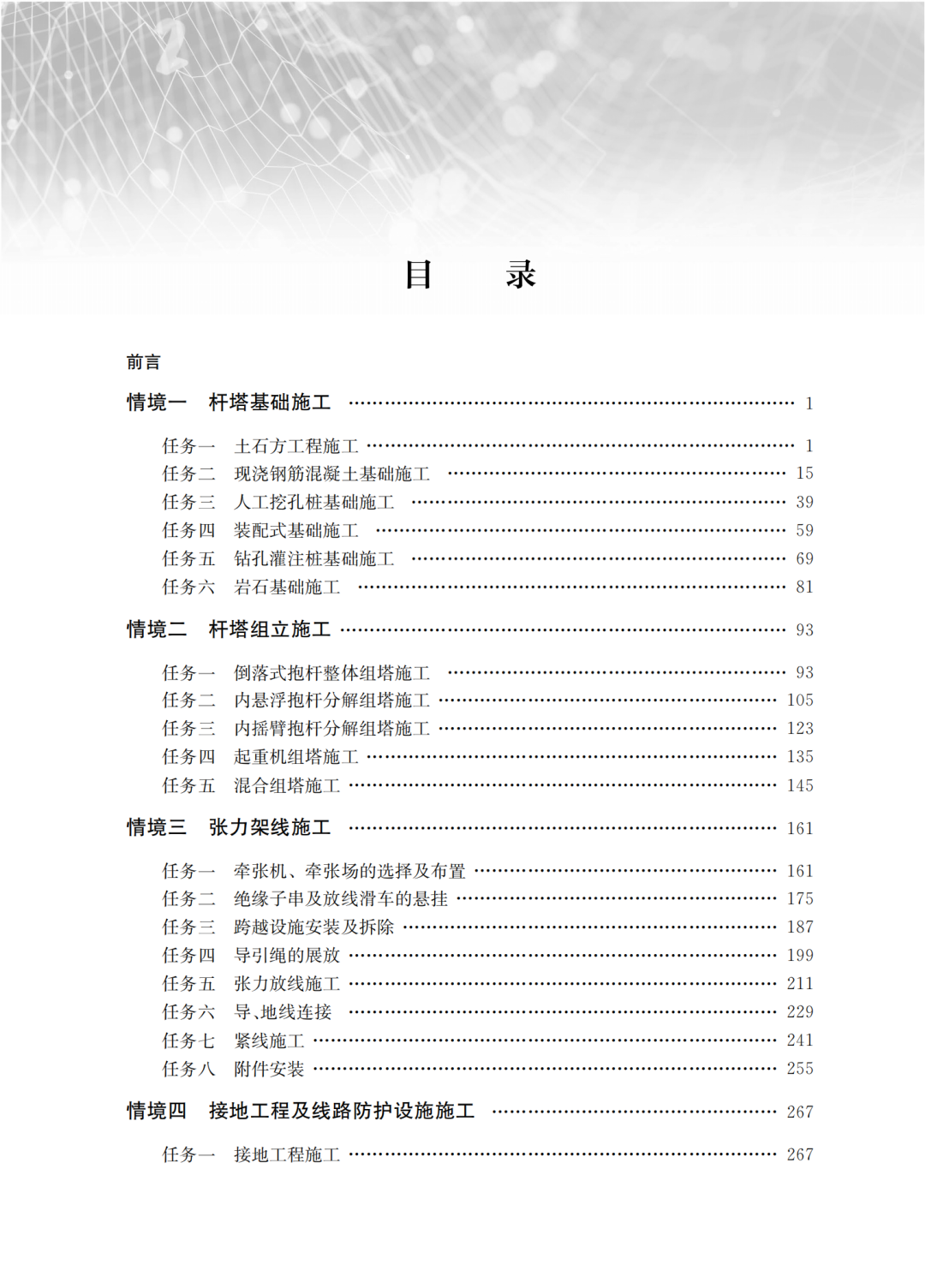 书共分六个学习情境,主要阐述了架空输电线路工程中的典型施工工艺。本书主要内容包括杆塔基础施工、杆塔组立施工、张力架线施工、接地工程及线路防护设施施工、输电线路施工新技术新工艺以及基本技能训练等。