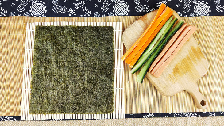 5. 把卷帘连同食材一起卷成桶状,尽量卷紧,放置10分钟定型;