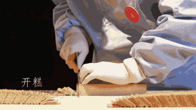 蒸好之后,由经验丰富的师傅进行开糕,均匀切成3毫米厚的片状。