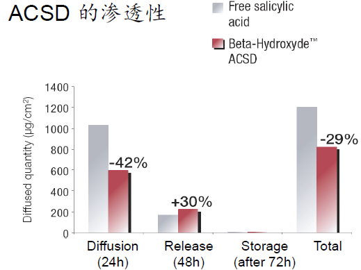 立体水杨酸通过将水杨酸的酸功能团和阿拉伯树胶的醇功能团按相同比例通过共价键结合而成,锁住了酸功能团从而可以降低易刺激、易过敏等问题。此外立体水杨酸有独特的控释技术,可以在24h内减缓42%的渗透,避免了水杨酸渗透过快,从而可以延长水杨酸在角质层的作用时间发挥去角质的作用。
