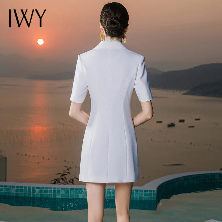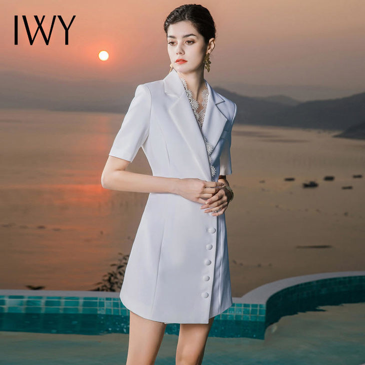 高级感法式设计职业白色连衣裙短袖气质女神范蕾丝装饰西装裙