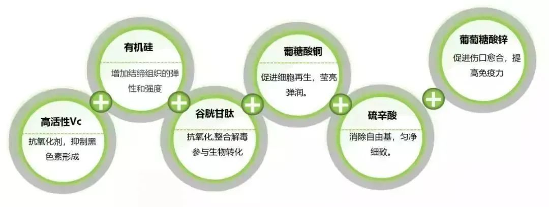 富含6种去黑功效成分:硫辛酸、有机硅、活性维C、谷胱甘肽等元素