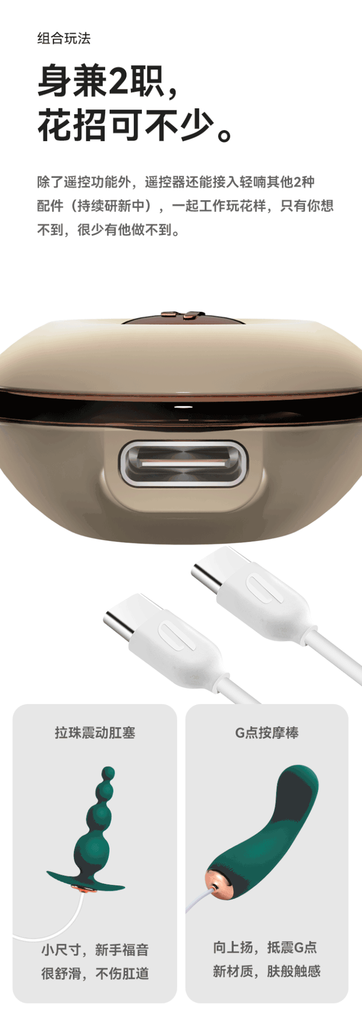 遥控器除了遥控乳夹之外,还可以接入轻喃的其它两款配件,包括肛塞和G点按摩棒,如果你之前购买过轻喃的三件套或四件套,就可以搭配里面的肛塞和G点棒一起玩啦!(三件套和四件套里面的乳夹是初代产品,和这款乳夹不同,这款是升级版哦)