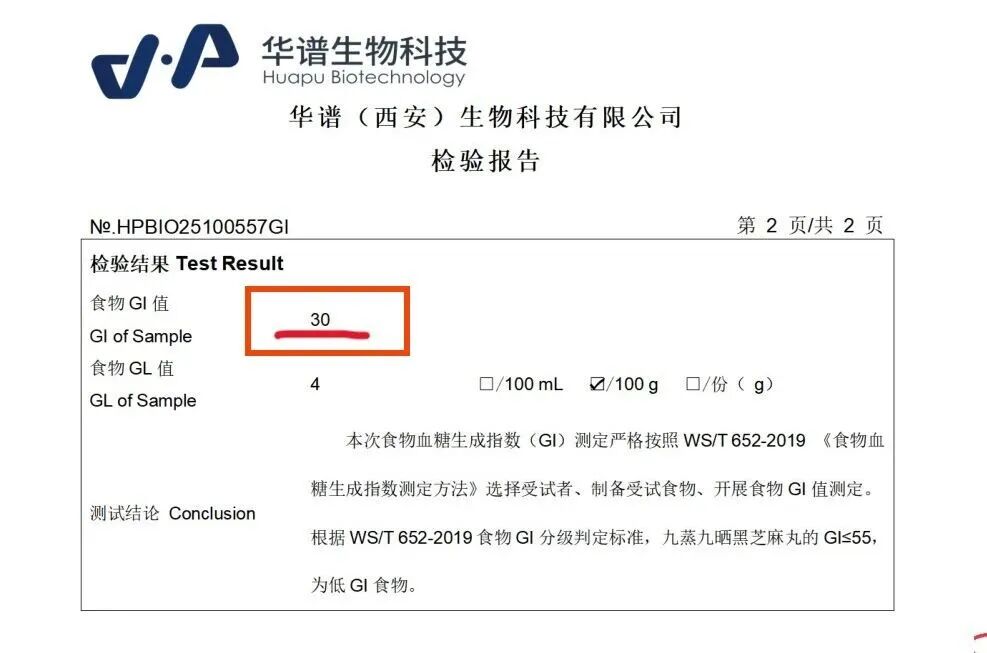 这不,前两天芝麻丸的低GI 检测报告出来了,咱们的芝麻丸GI值是30,远低于低GI产品的标准线(55)