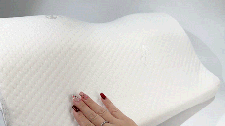 👉因为它是这种蝶形枕嘛,躺下去的区域做了仿生蝶翼曲线设计+前凹式颈部托扶区域,可以完美贴合我们的脖颈!