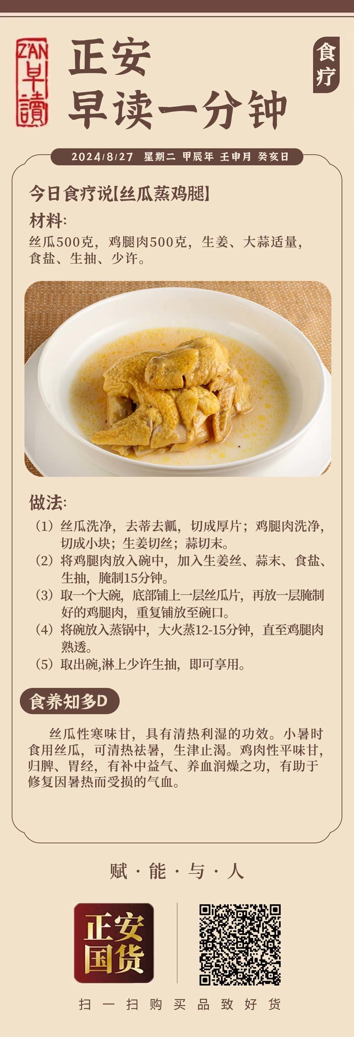 8月27日 应季食方【丝瓜蒸鸡腿】养血润燥