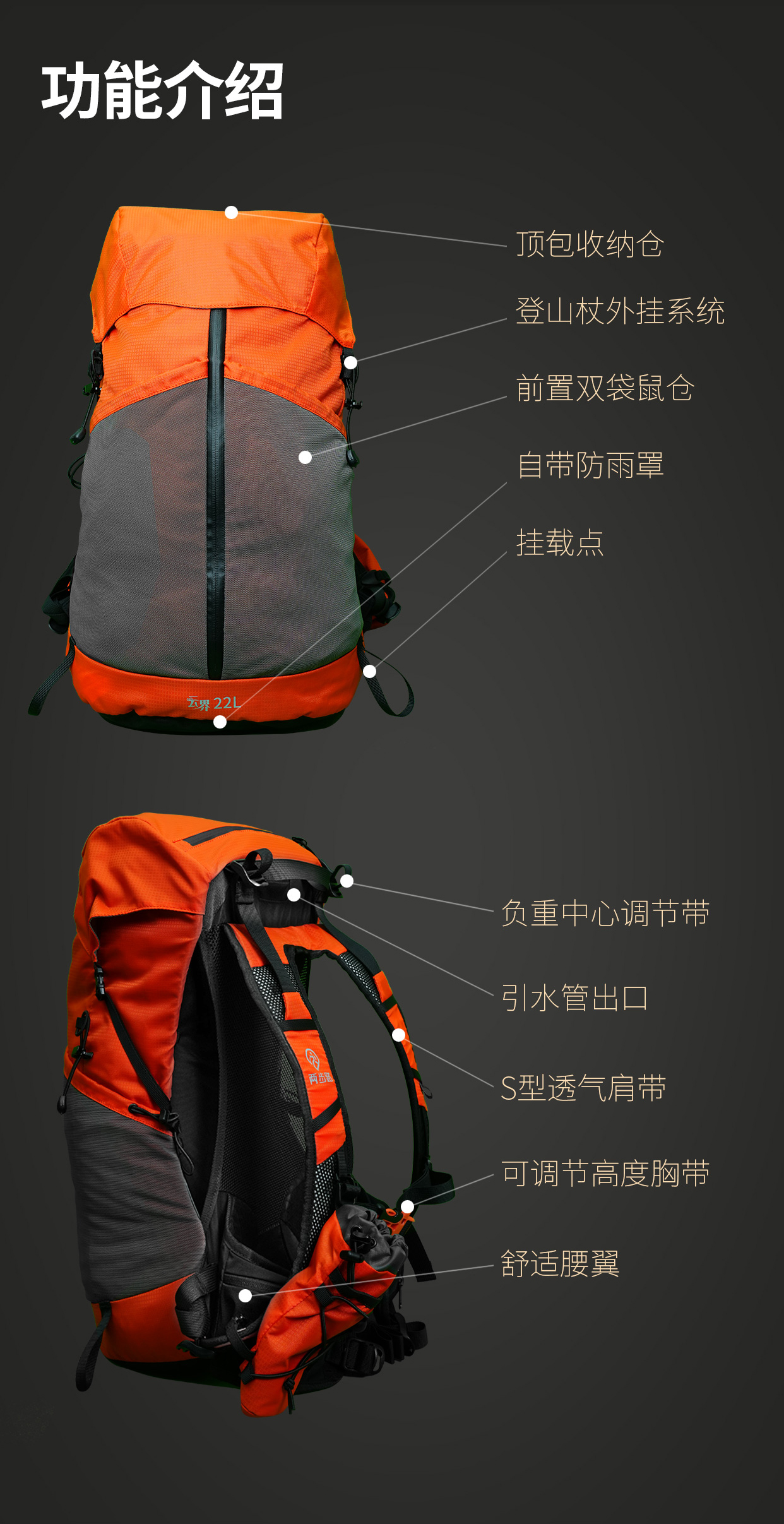 主仓+水袋仓+袋鼠仓+顶包+独立灵动附包的分仓设计,直接满足驴友的不同装备收纳需求!