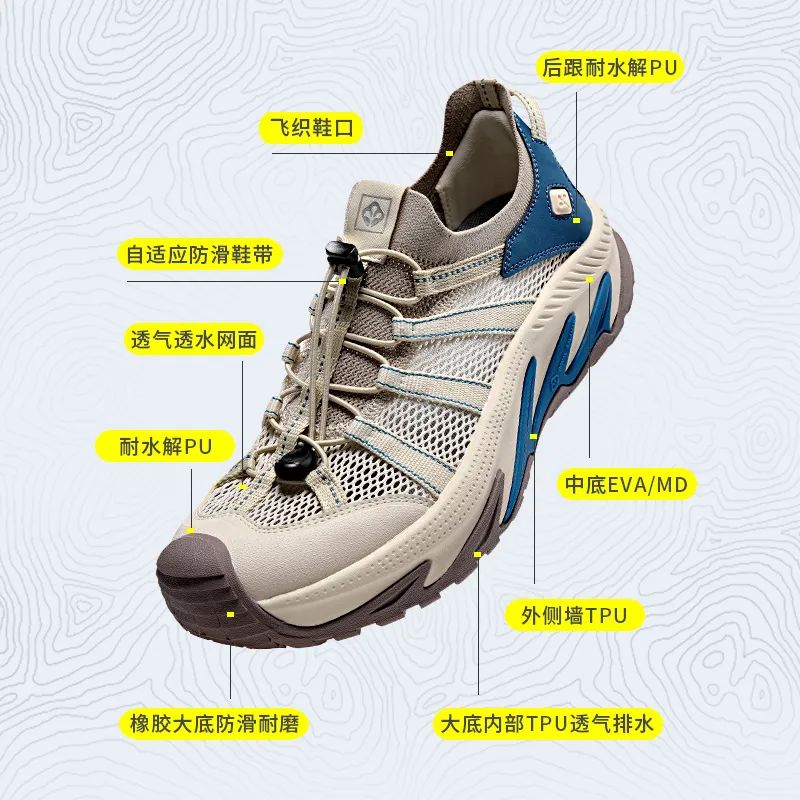 在设计上有两大特点:一是保护脚趾,防止在户外被石头刮破;二是透气、透水,快速干燥。