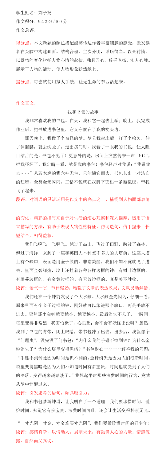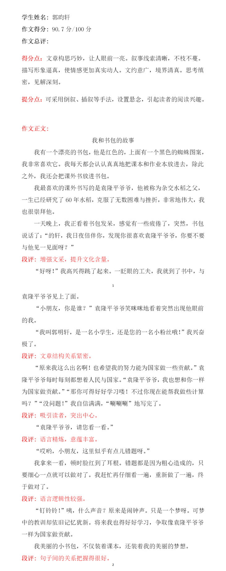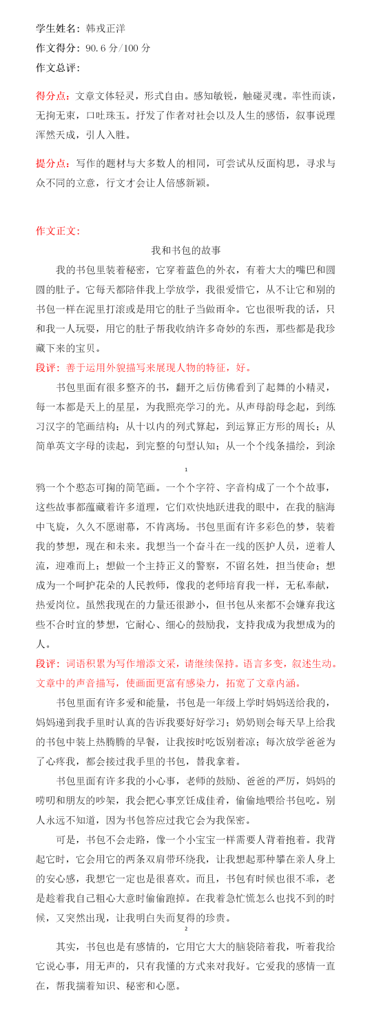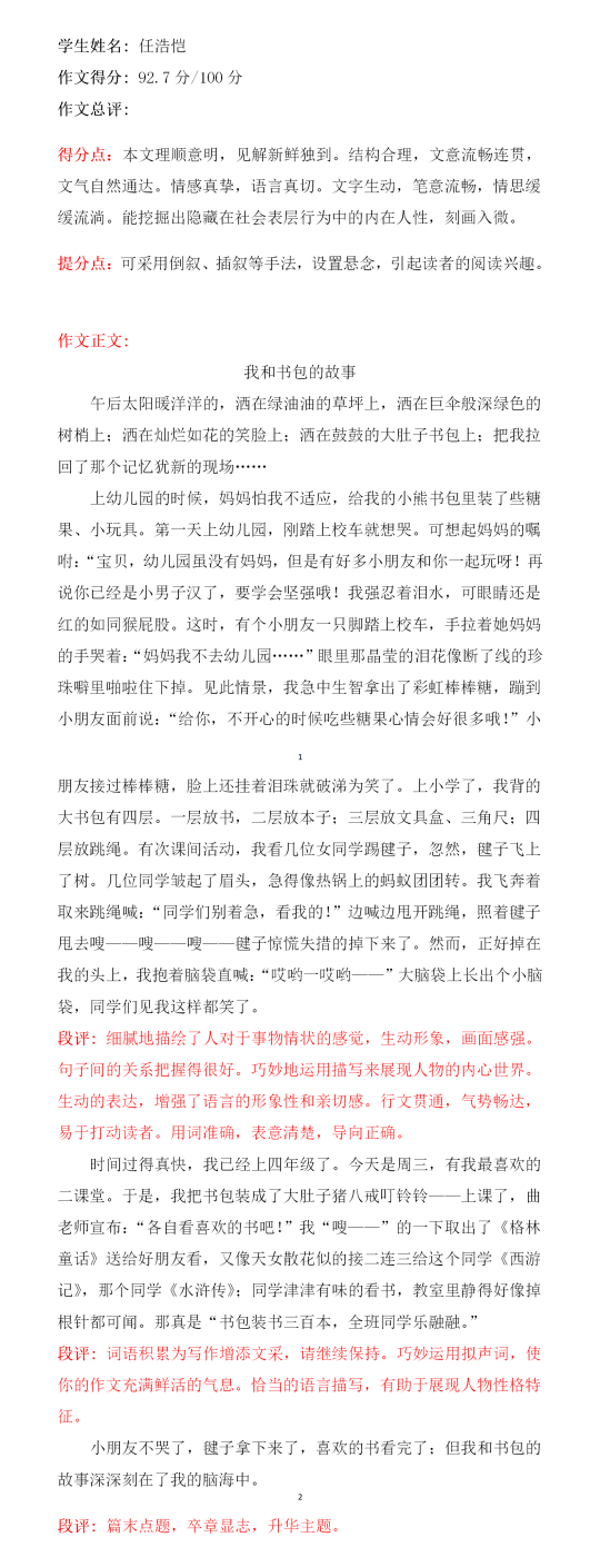 本篇文章没有华丽的语言,却道出对书包的真情实感,把极其普通的书包描写成了“百宝箱”,并将自己的真善美表达在字里行间,让人身临其境,是篇不错的佳作。