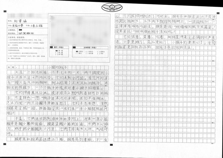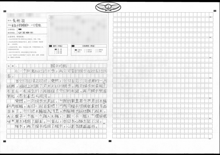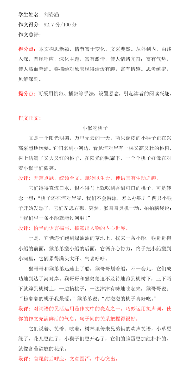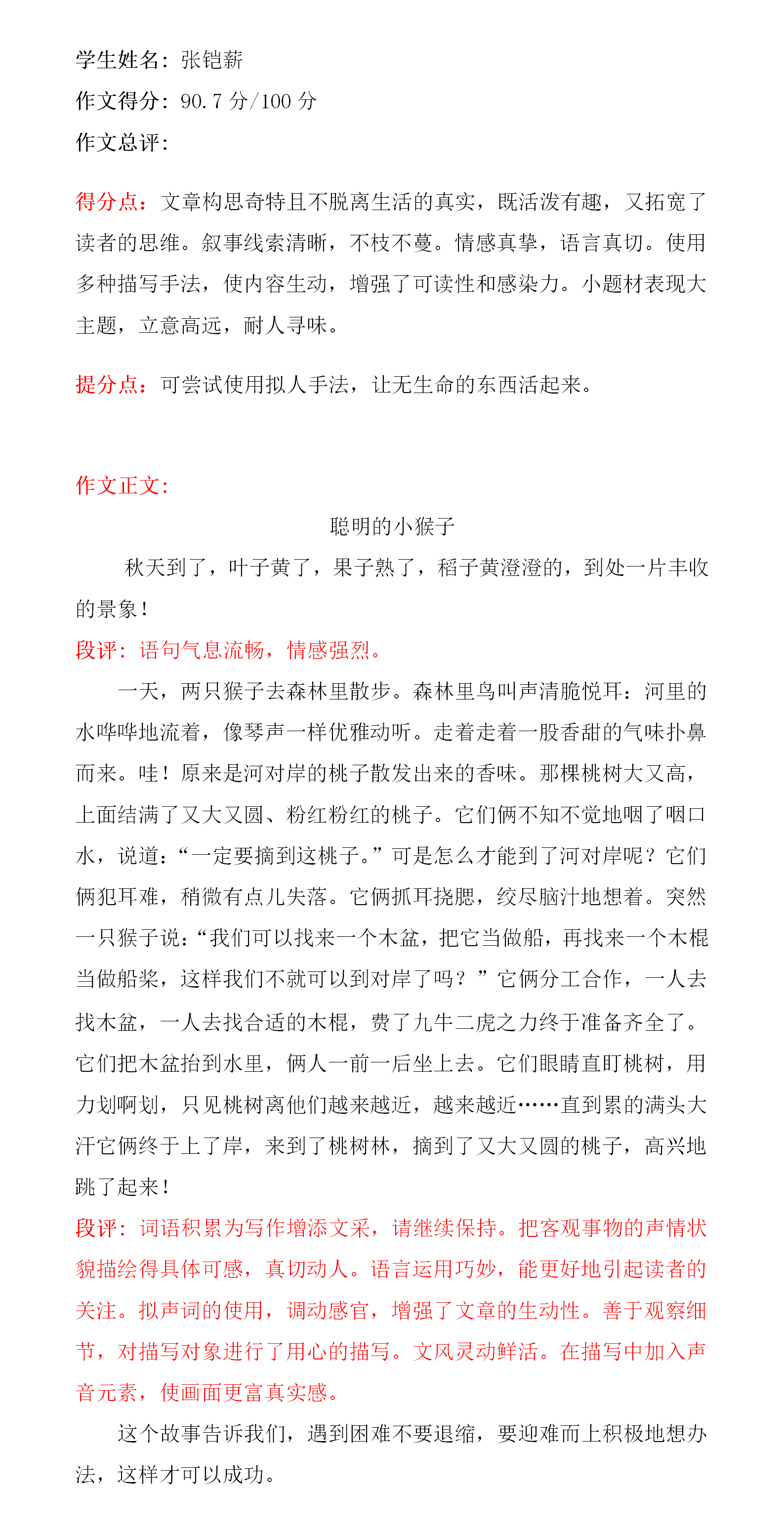 本篇文章,根据画面内容展开想象,写出了小猴子的动作、语言、神态,活灵活现,把两只爱动脑筋、懂得齐心协力的小猴子淋漓尽致地表现了出来!