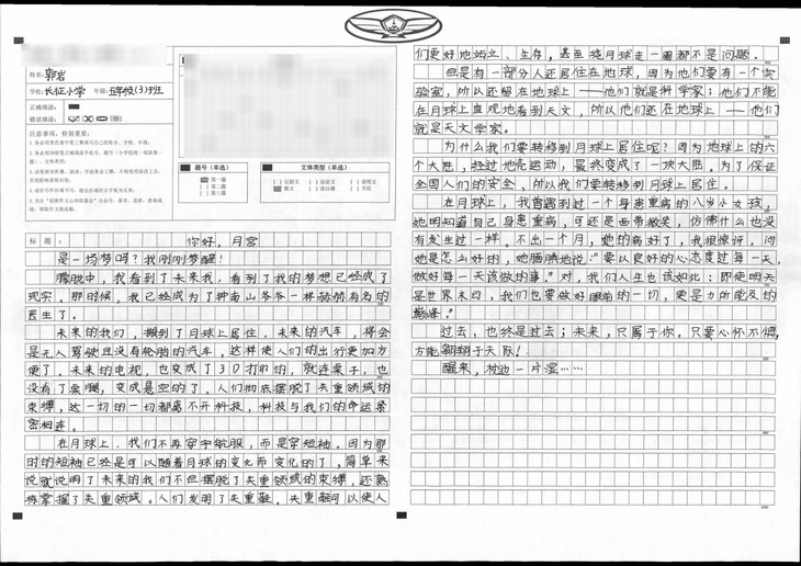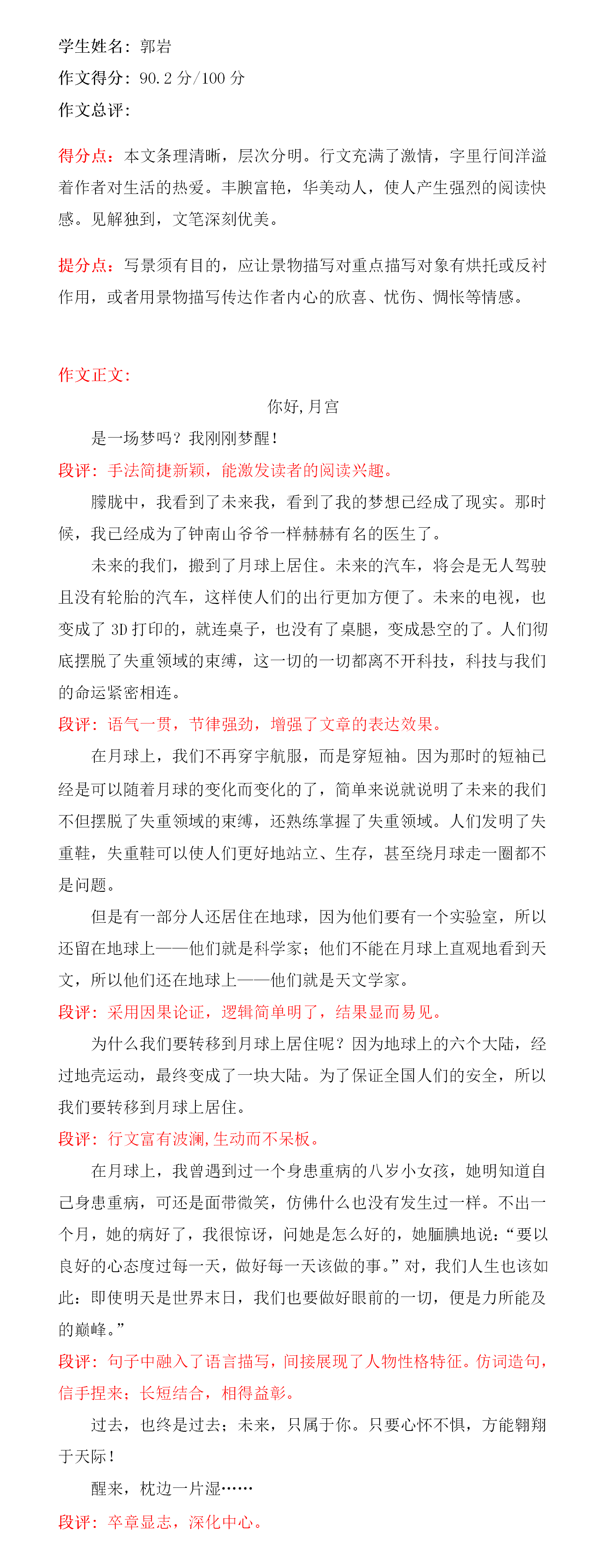 这篇文章是我通过了解现代科技、再依靠想象完成的。在文章中我提到了月亮,是因为古代人希望自己有朝一日能够去往月亮之上。随着科技的发展,我国的火箭终于摆脱了地球引力登上了月球,在月球上第一次竖起了中国国旗。这体现了大国梦想,这也是中国梦的一部分。大国梦是由每个人的梦想组成的,只要坚持并且努力去实践自己的梦想,向着梦想进发,有朝一日,梦想一定会实现。文末中的“只有心怀不惧,方能翱翔于天际”我认为是对逐梦过程最好的诠释,只要有勇气去追求梦想,成功离我们仅有一步之遥!
