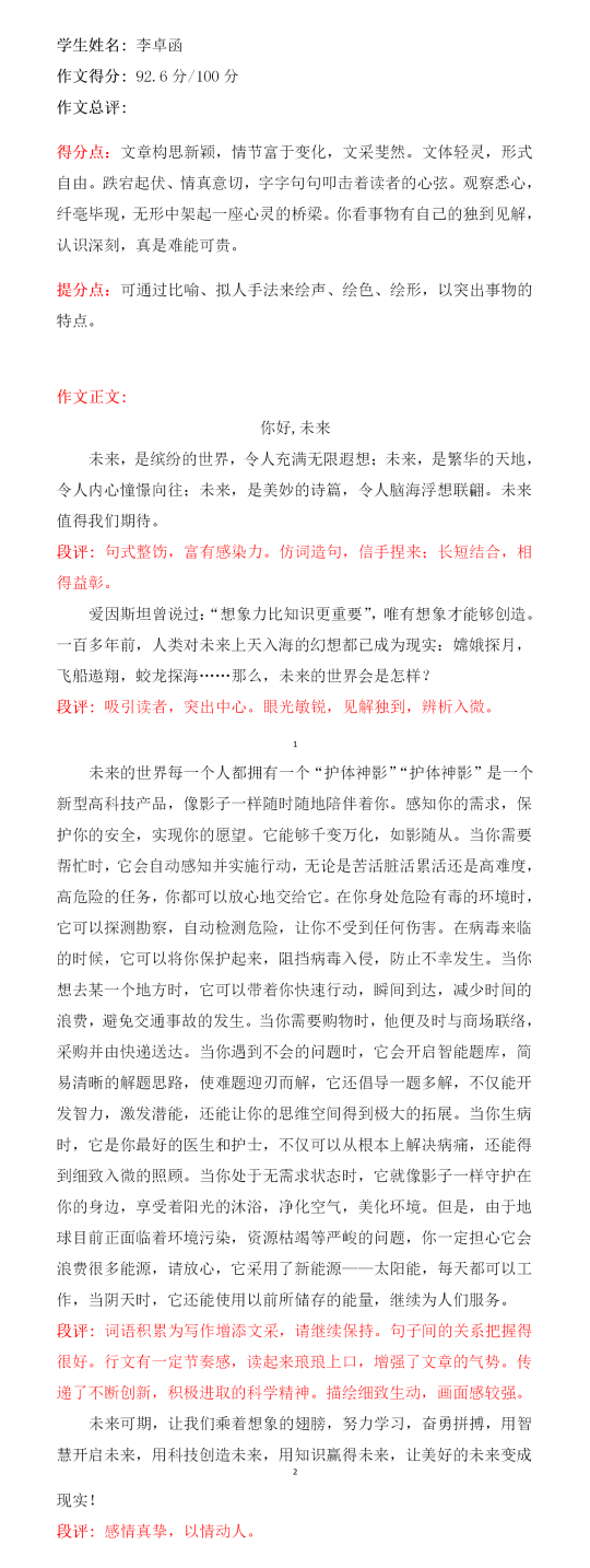 写作则是孩子探索世界的另一个角度,他常常将自己的所见、所思、所想用文字的形式记录下来。这篇文章中的科技色彩是孩子将两个兴趣爱好结合了起来,我们也希望他在今后的学习中能将这两个方面更好的融合,助力自己更好的进步!