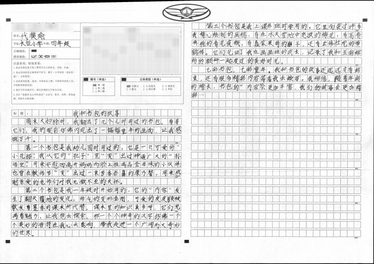 代濮瑜同学思维活跃,热爱阅读,文学底蕴深厚,是个积极上进的好孩子。这篇文章他写了自己不同时期的三个书包,字句饱含着对书包的喜爱。在他眼里,书包传递着关心,蕴含着知识,见证着成长,象征着七彩的童年。 语句优美,条理分明,结尾更是升华主题,读来让人意犹未尽。
